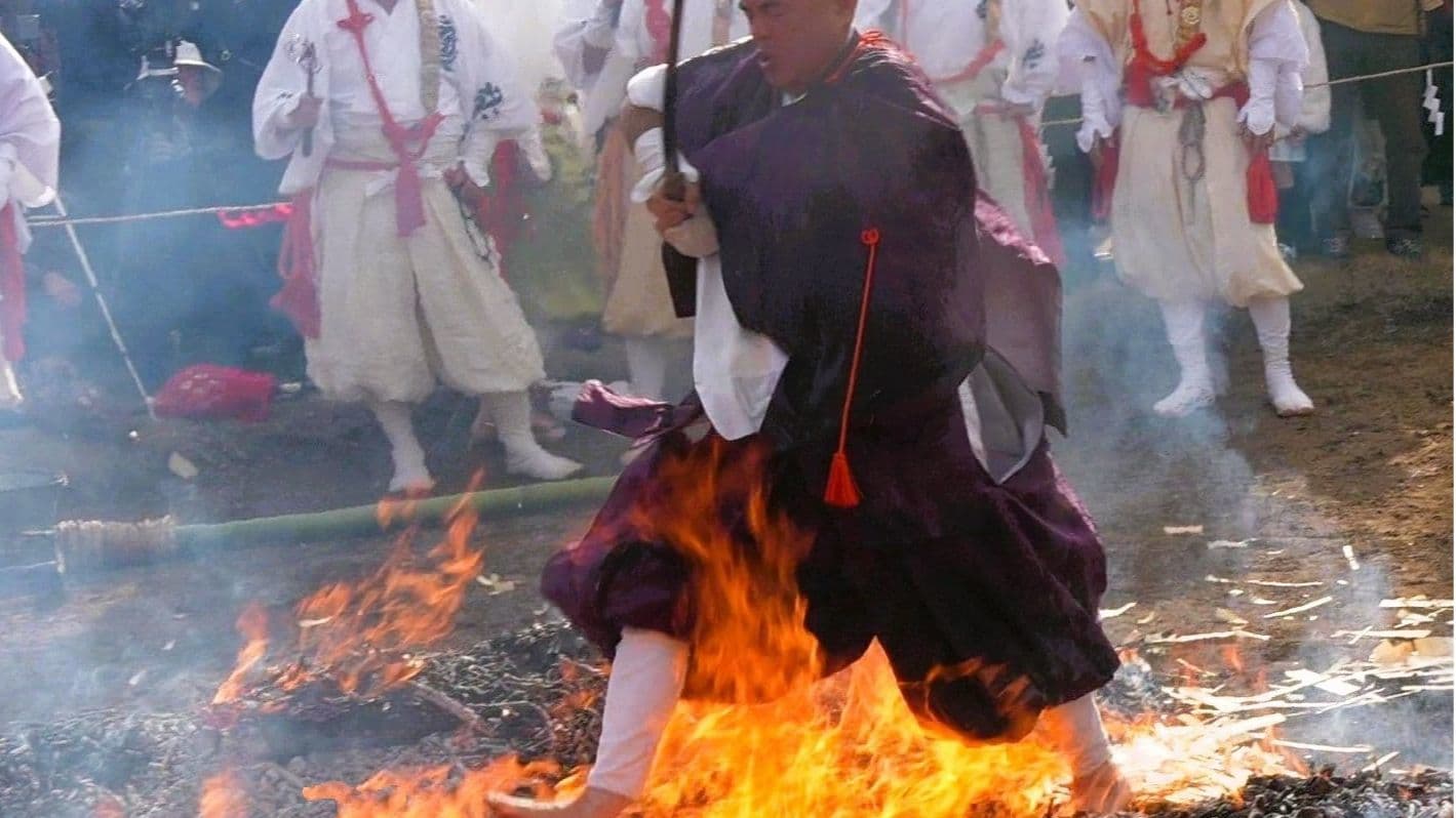 関東山伏数十名が結集し高声読経の中、素足で火の中を渡り自身心を浄める、所謂『火渡り』が修行されます。当日は、千年来の歴史を持つ山伏の所作法、熱湯を頭からかぶる『湯立て』の修行も行われ、多数の参拝人で賑わいます。