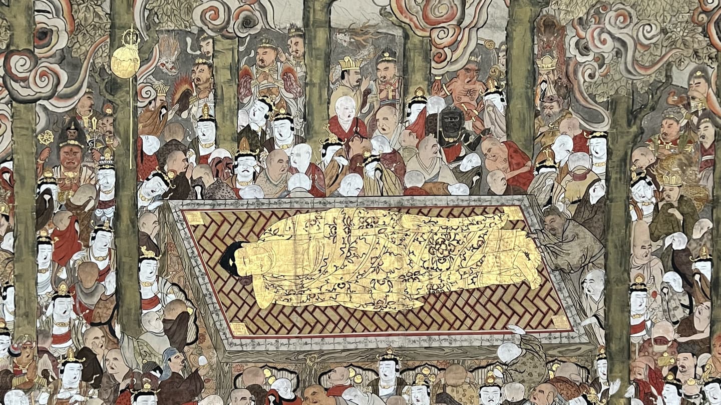 この法要は、2500年前インドで入寂されたお釈迦様を供養するもので、畳三枚分ほどの大涅槃図を掛けて供養します。