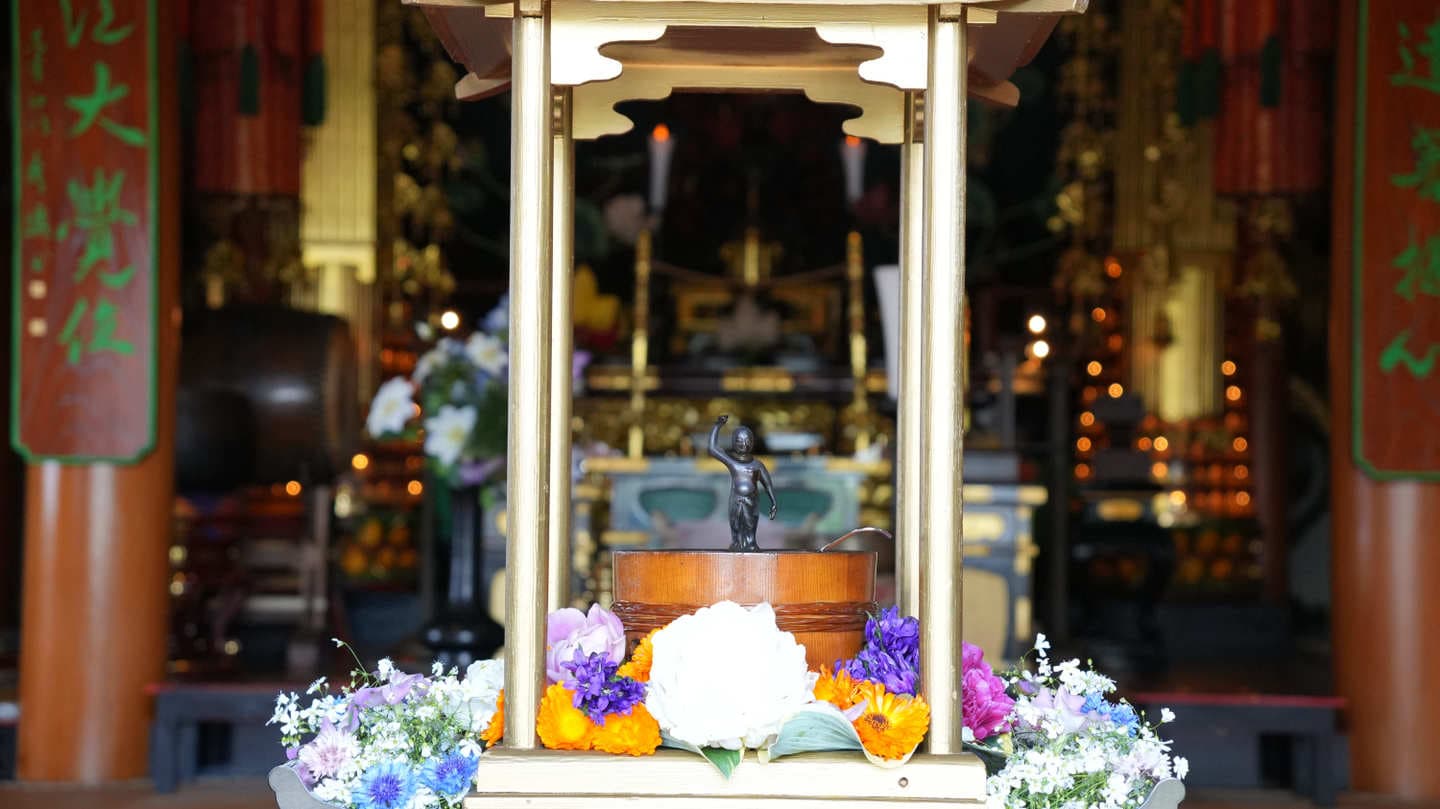 当山では5月8日に行っています。この日はお釈迦様の誕生日であり、「天上天下唯我独尊」と天と地を指した赤ちゃんの釈迦像を花御堂にお祀りし、甘茶をかけて供養します。