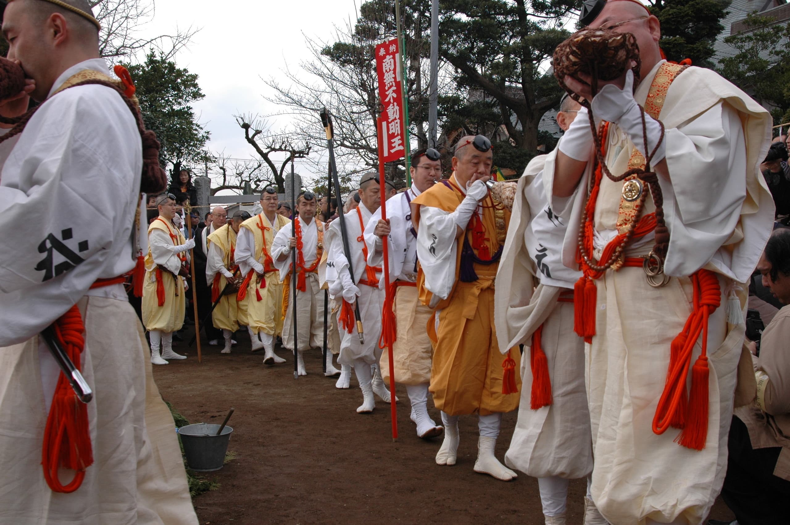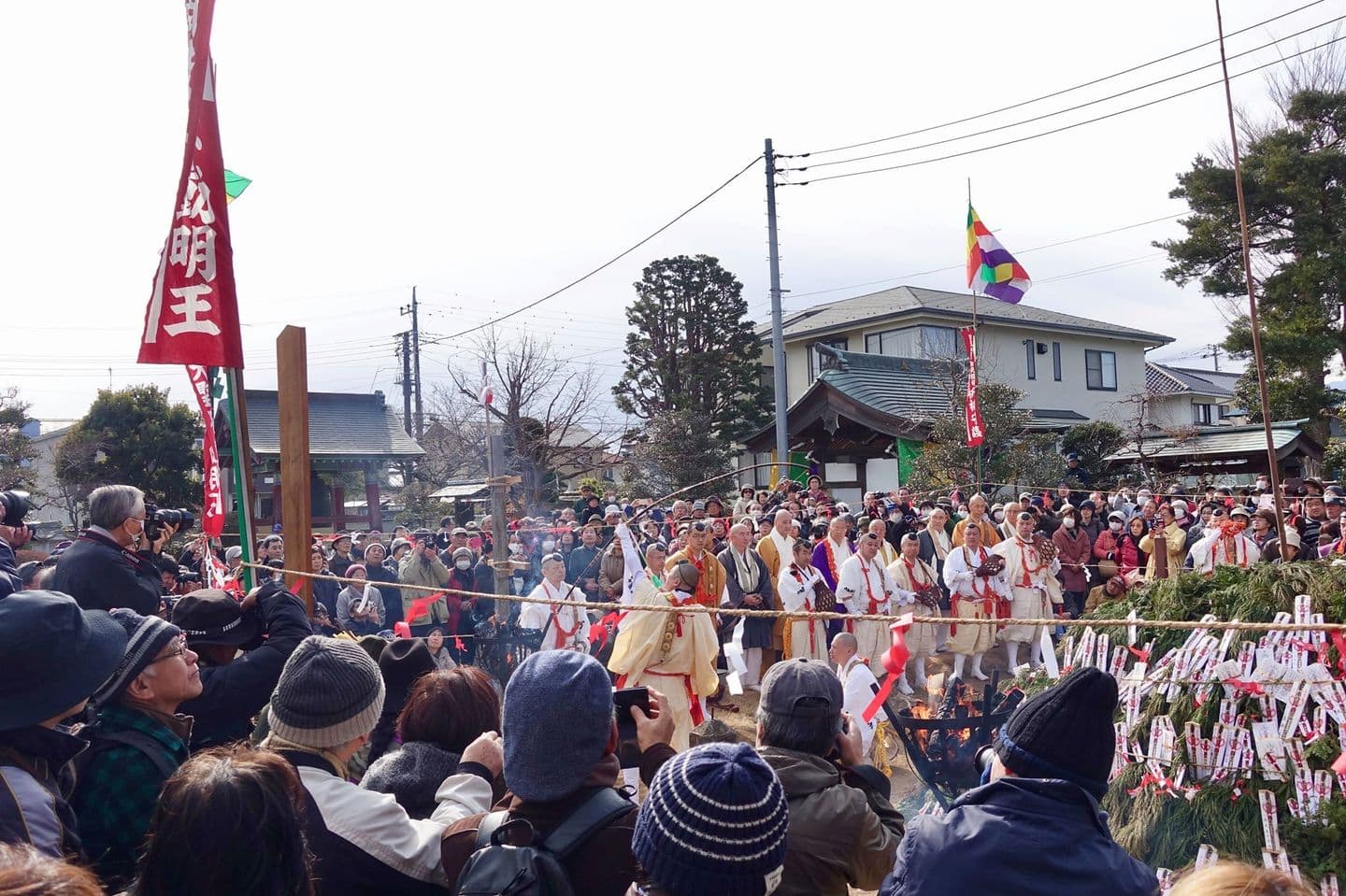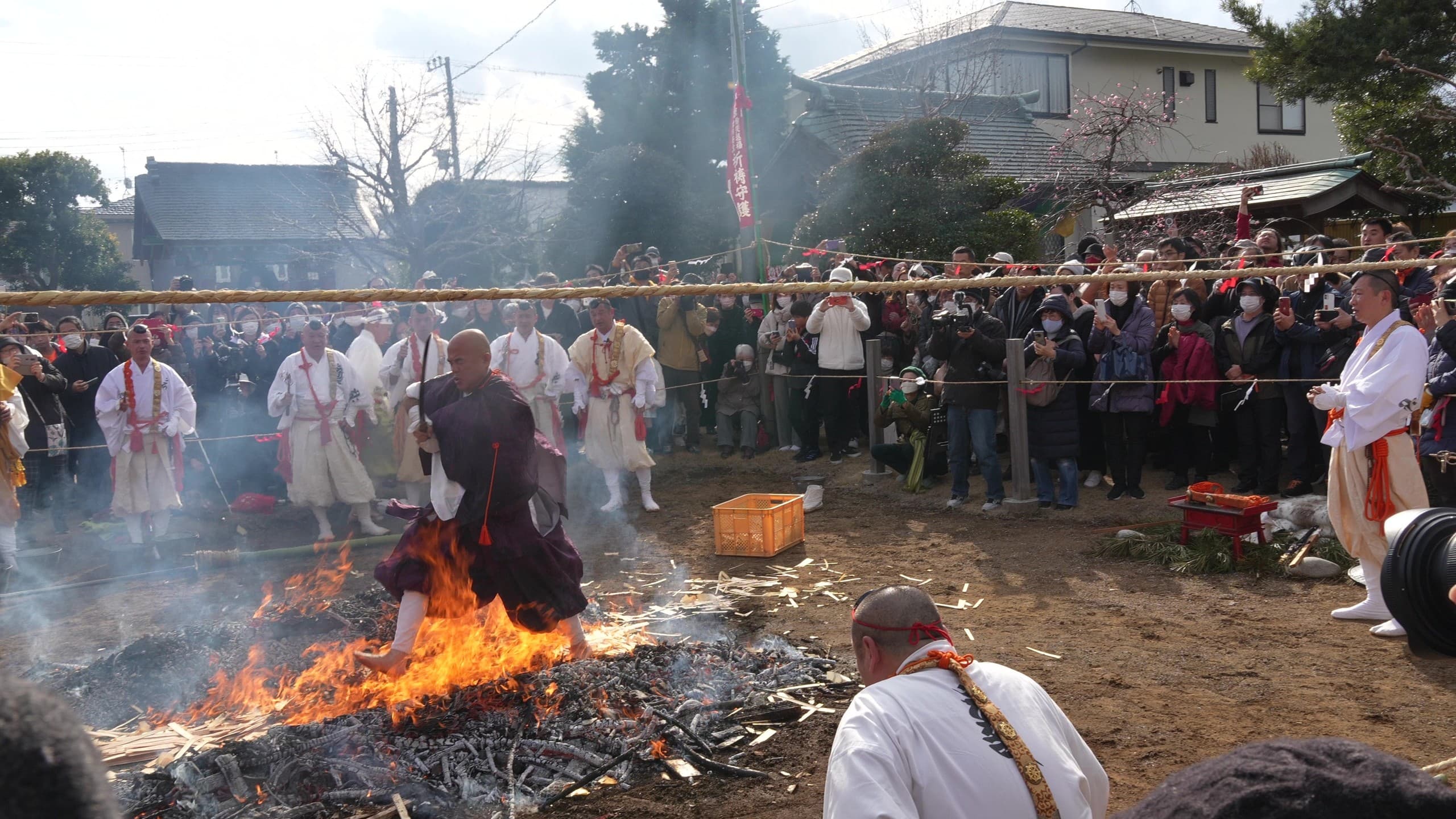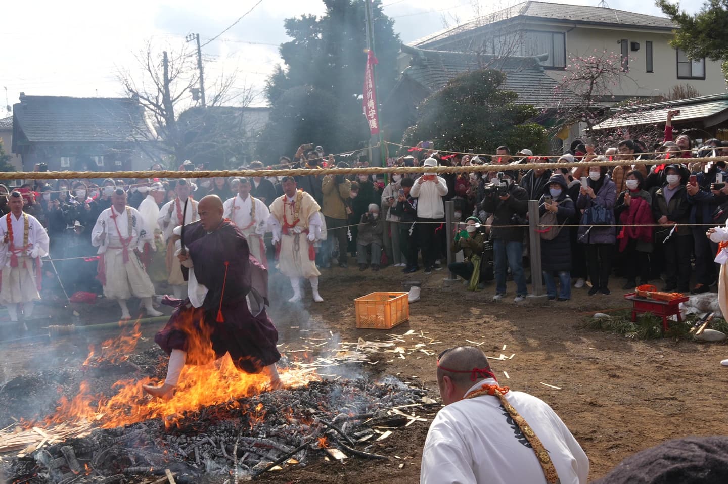 当日は先ず、本堂内にて護摩修行、その後境内道場にて火渡り修行となります。火渡りには、関東一円から修験者達が結集し、湯立て式(熱湯を頭からかぶる)・山伏問答・神木登り・宝剣・宝弓・宝槍・宝斧などの修験道千年来の秘法が公開されます。