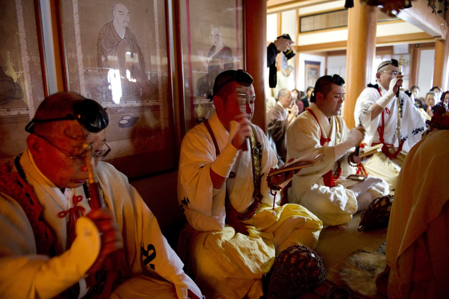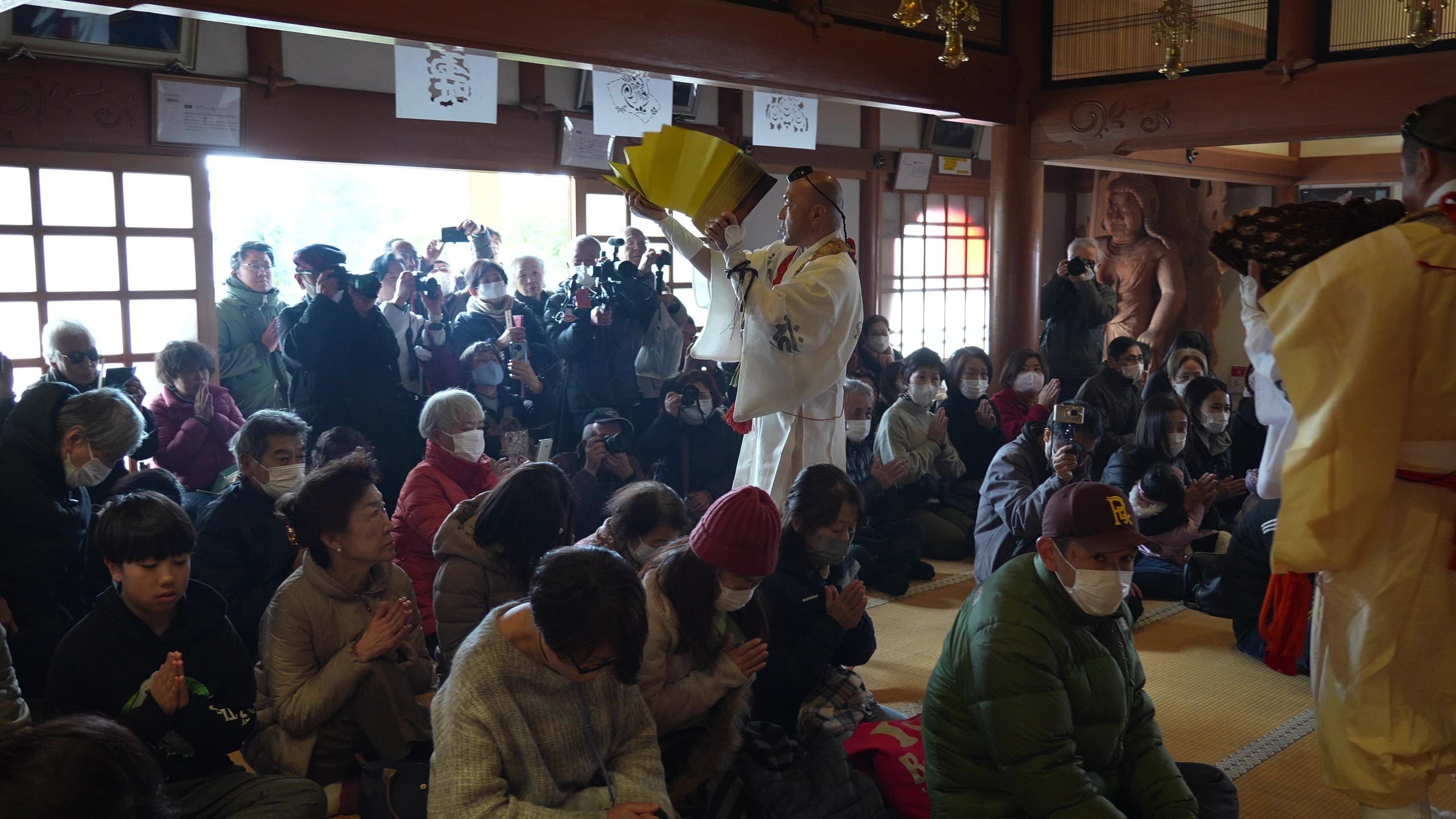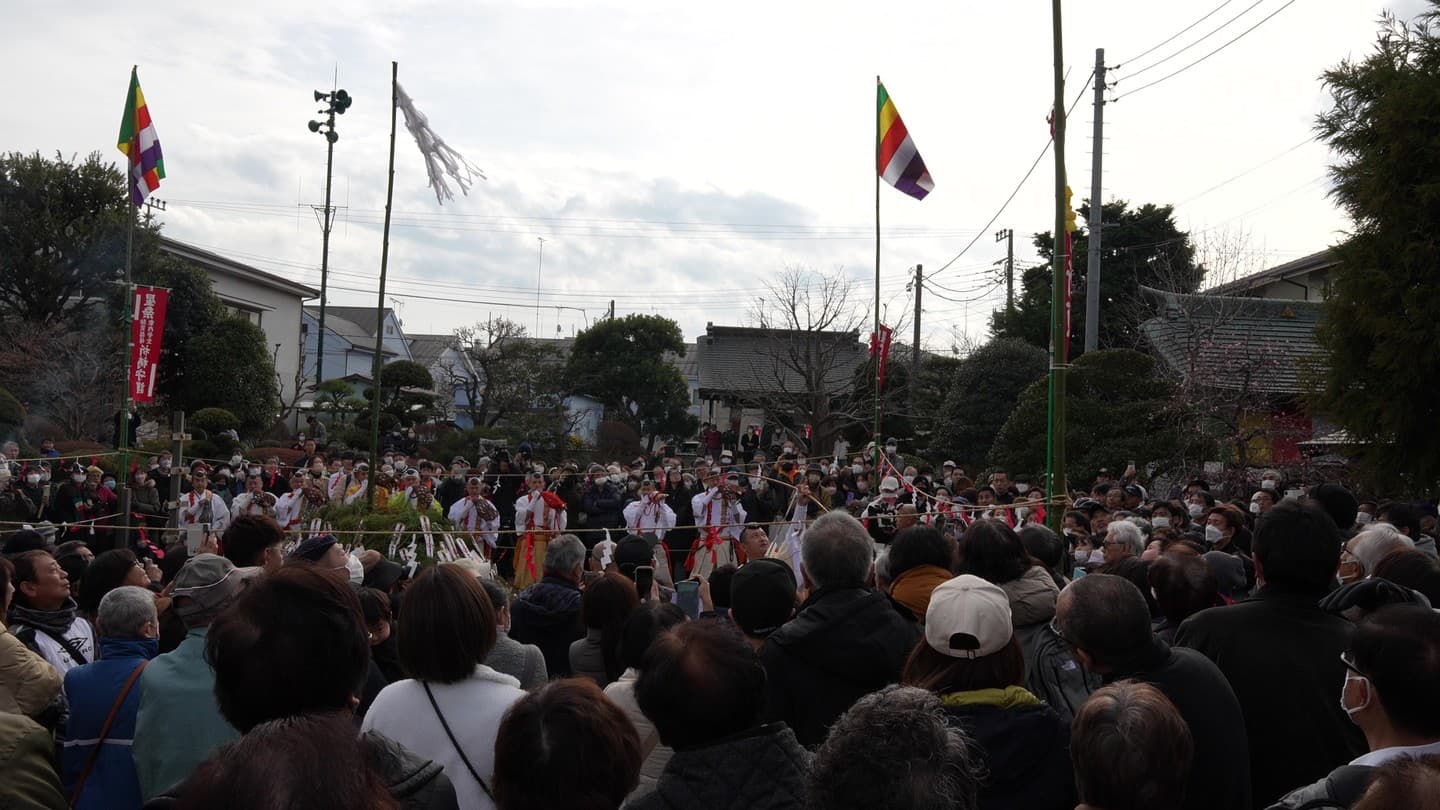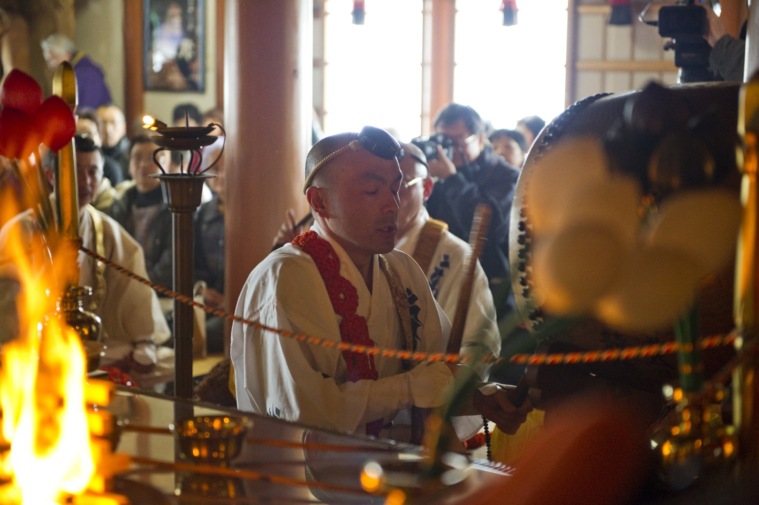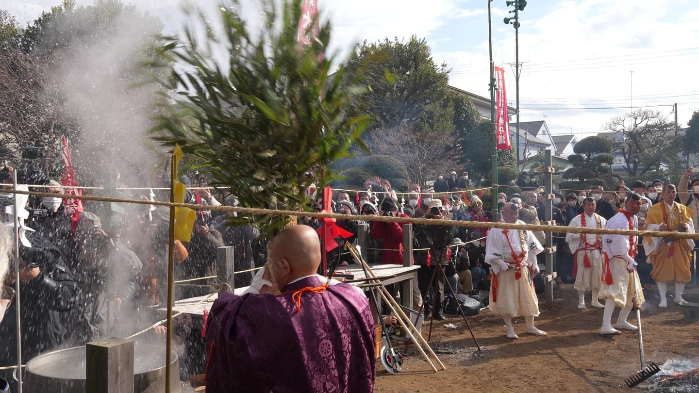 当日は先ず、本堂内にて護摩修行、その後境内道場にて火渡り修行となります。火渡りには、関東一円から修験者達が結集し、湯立て式(熱湯を頭からかぶる)・山伏問答・神木登り・宝剣・宝弓・宝槍・宝斧などの修験道千年来の秘法が公開されます。
