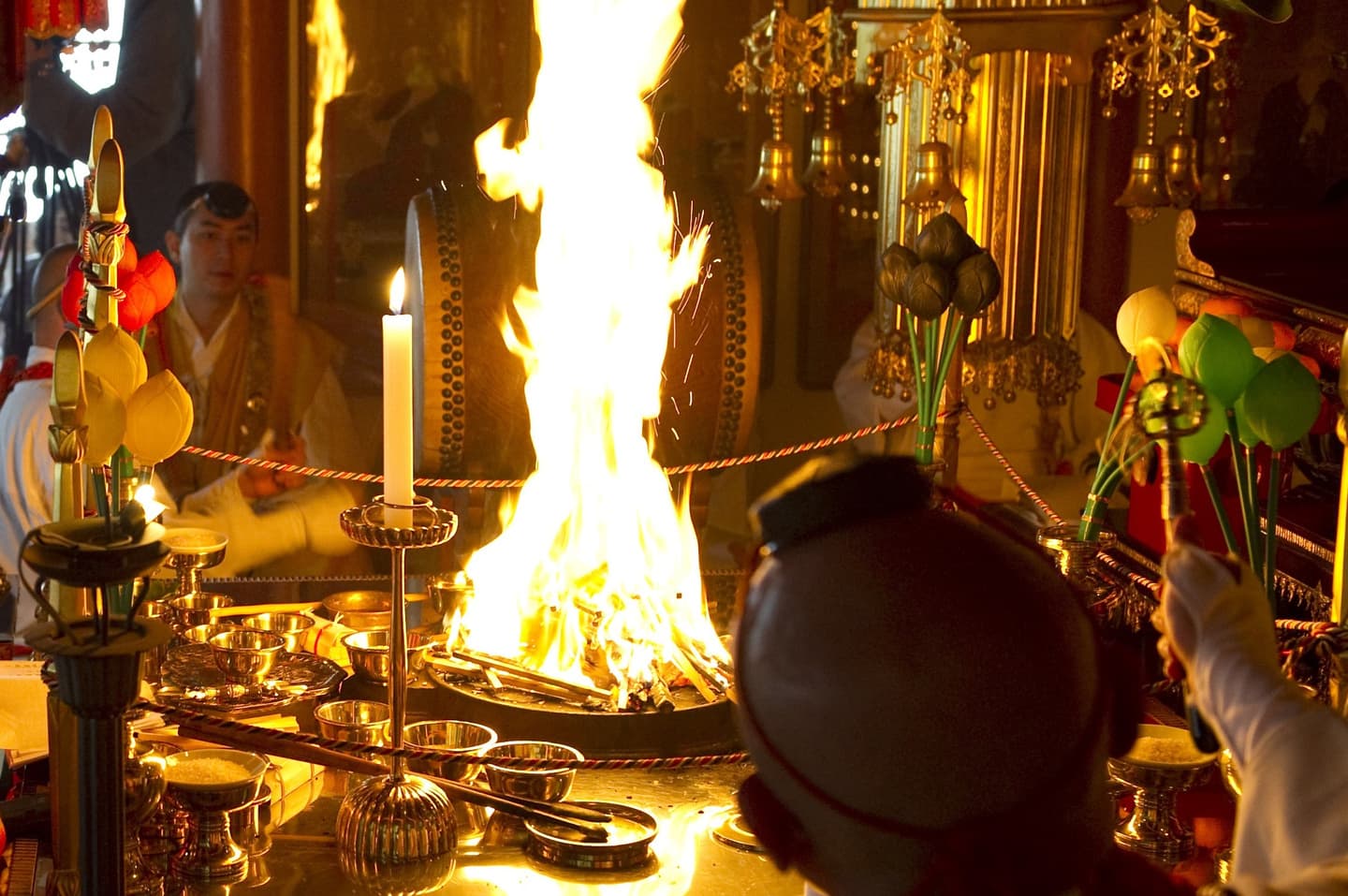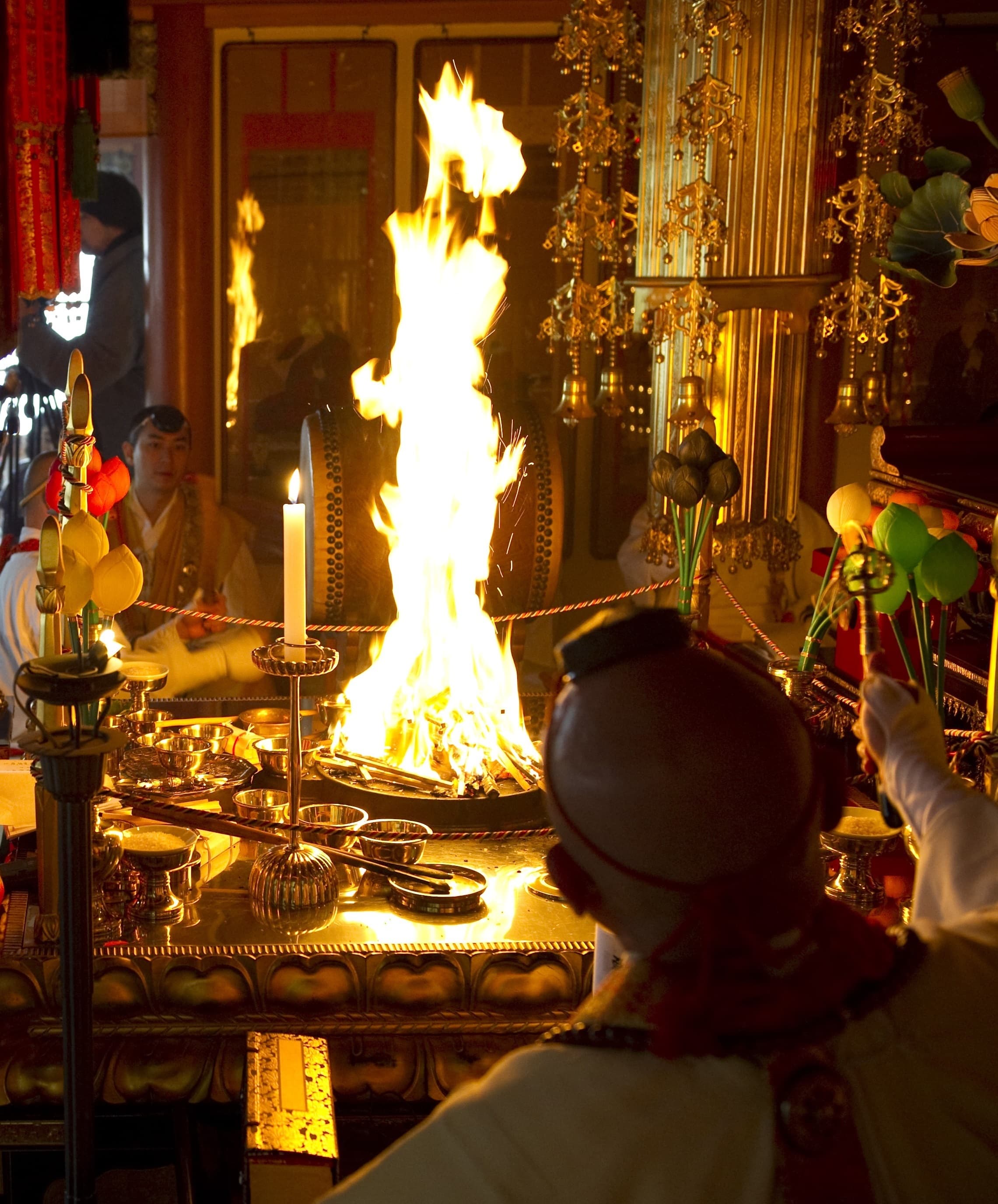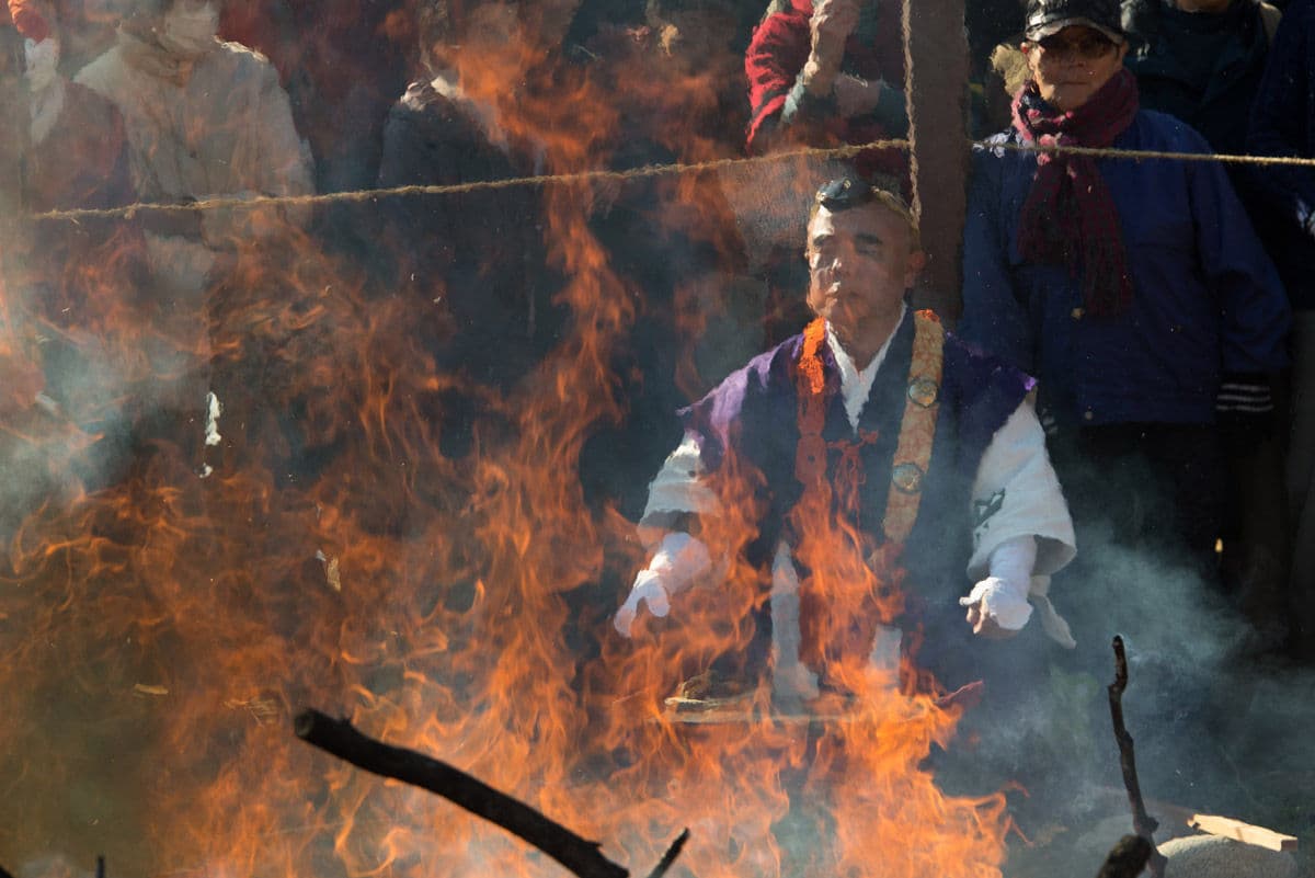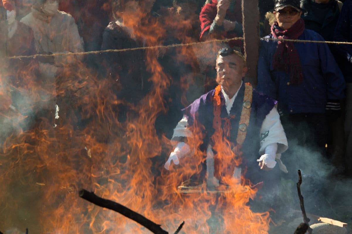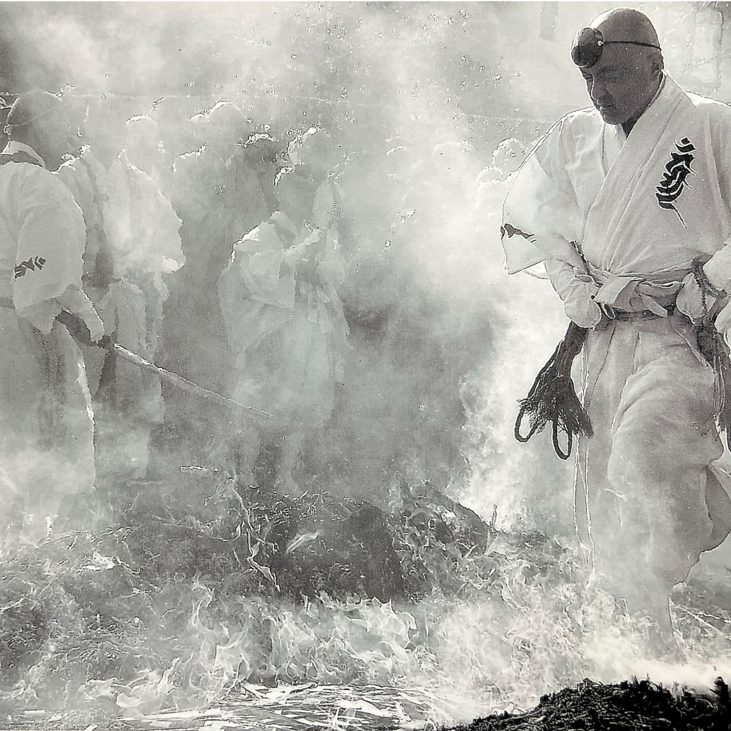 『火渡り』とは修験道に伝わる儀式で、縦・横・高さ数メートルに組んだ薪で護摩(柴灯護摩)を焚き、熾火の上を素足で渡る修行です。不動明王と同じ姿になりその境地を体現するために、火の上を渡るのです。