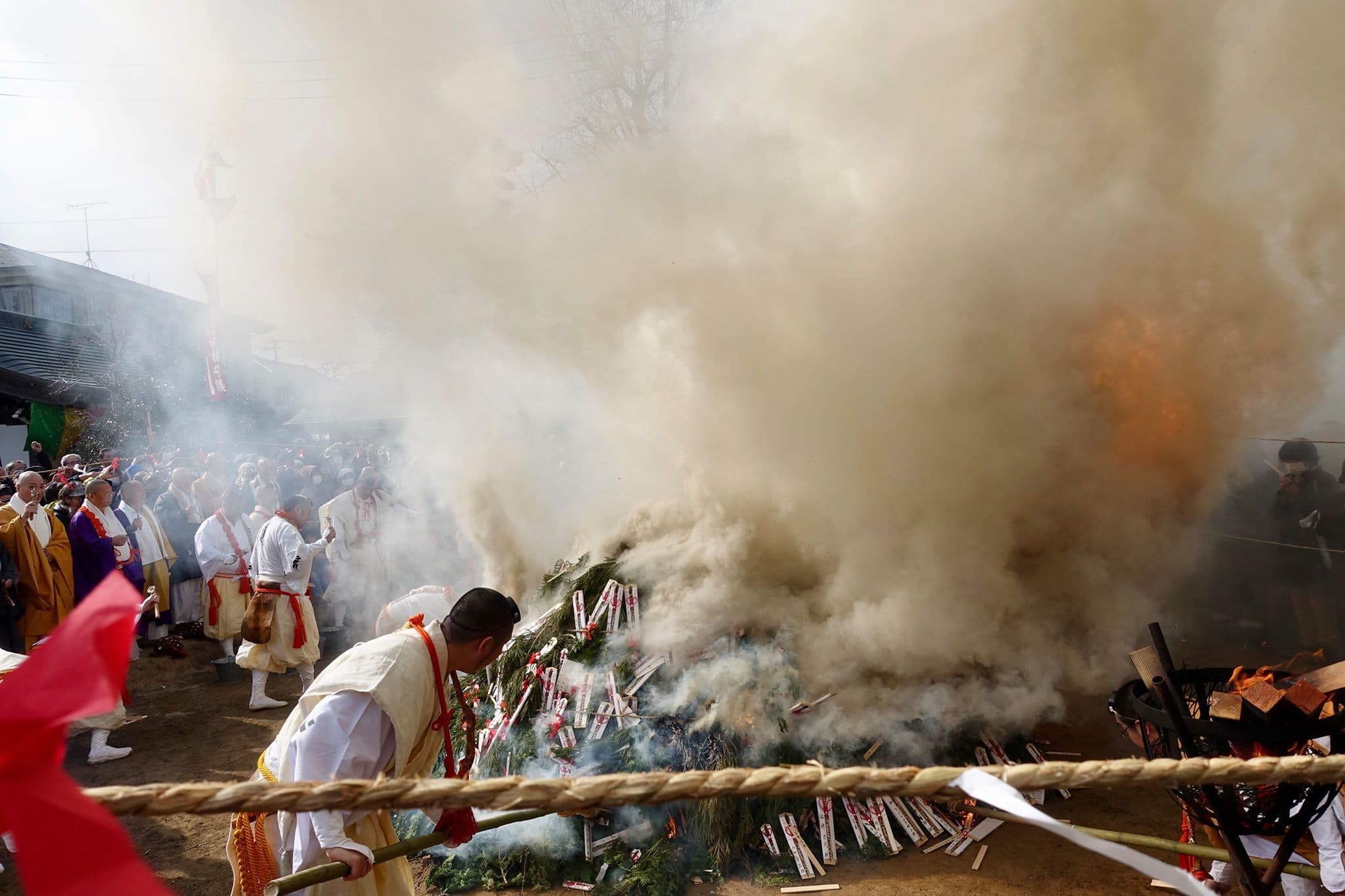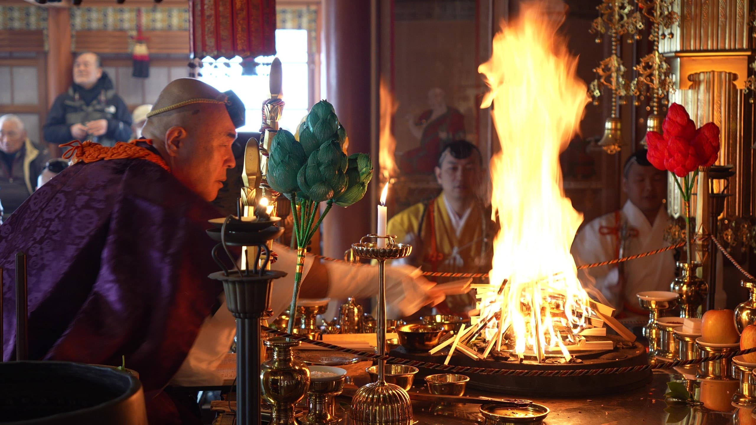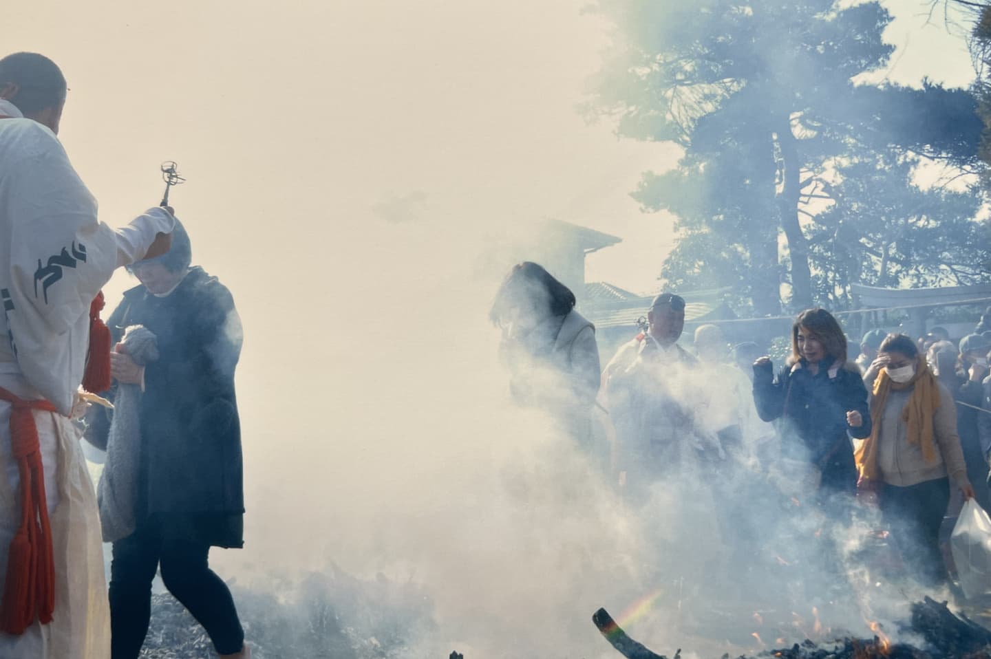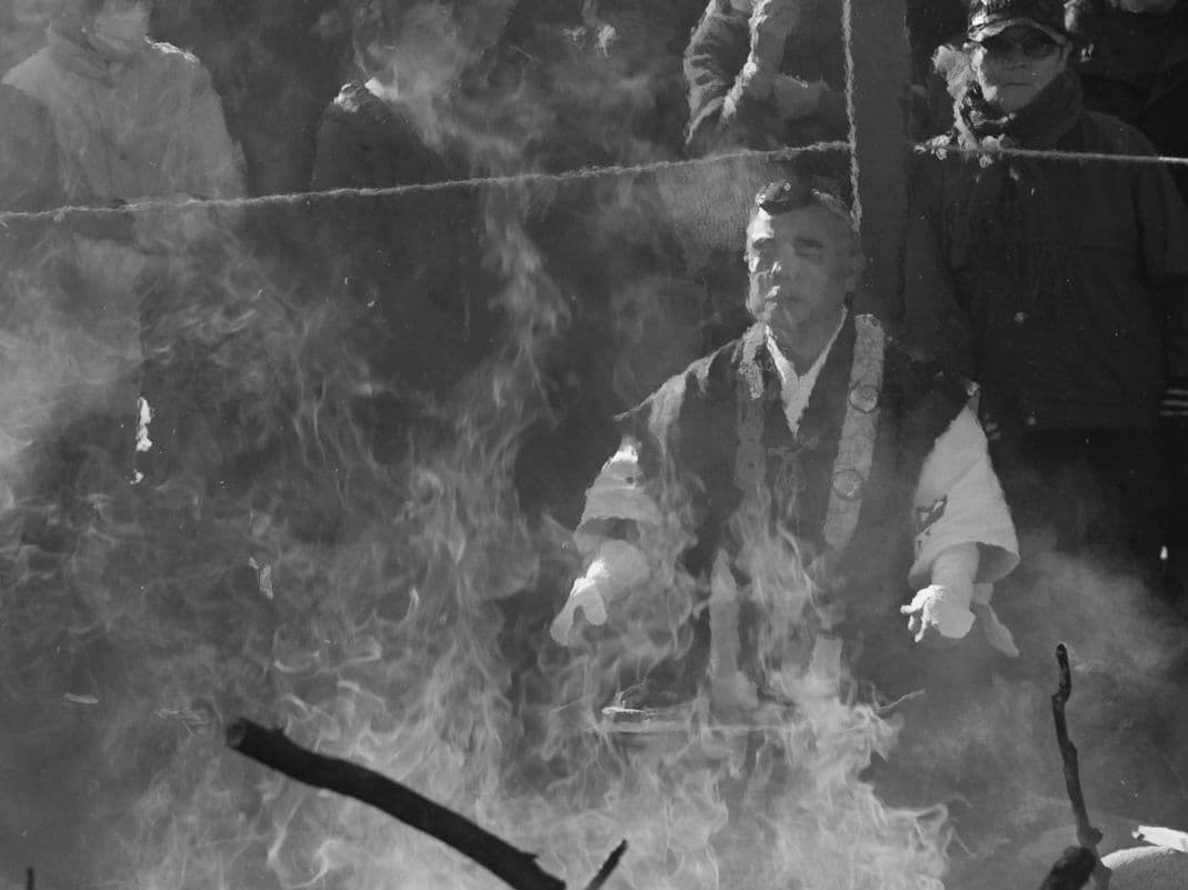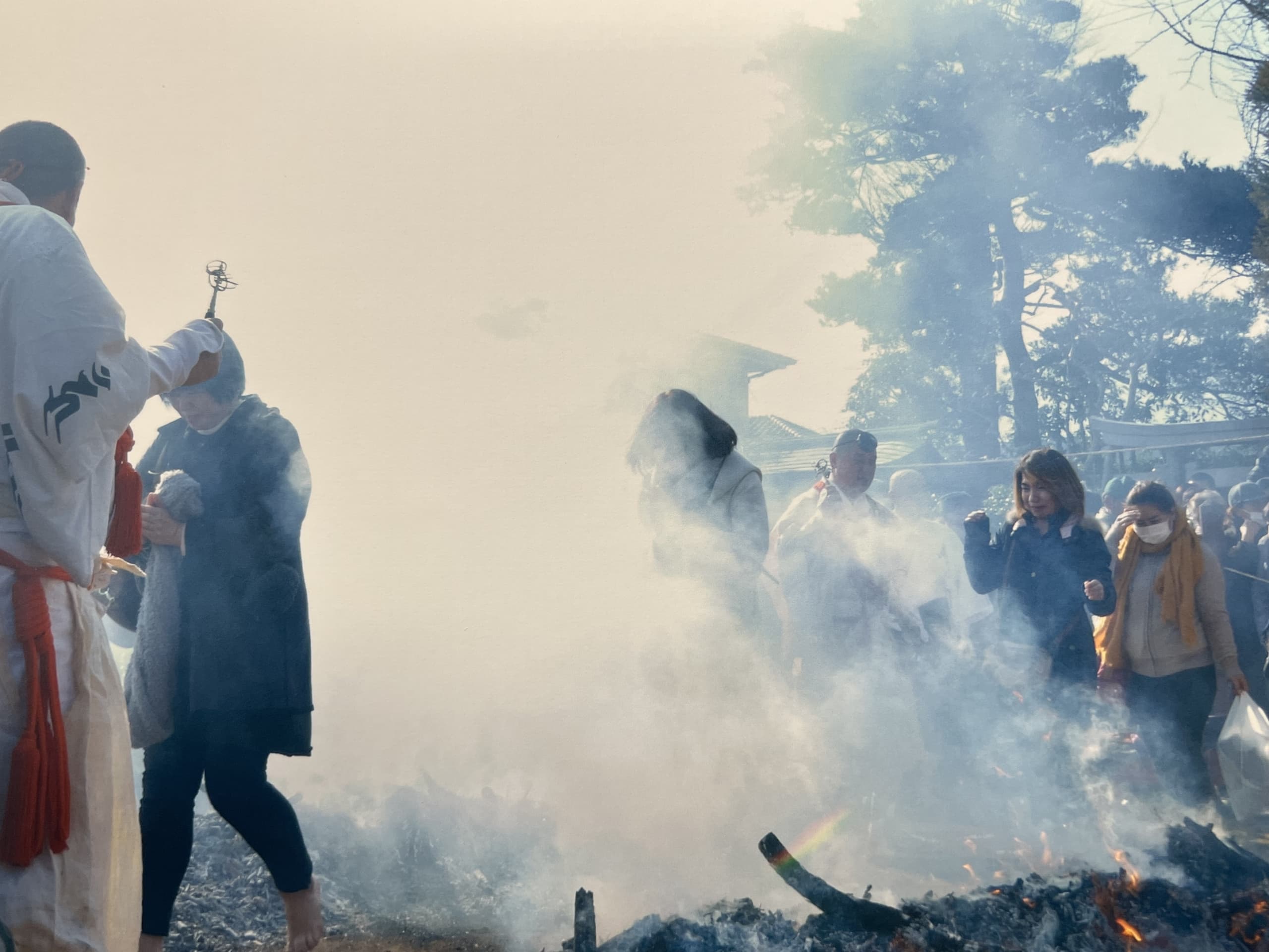 『火渡り』とは修験道に伝わる儀式で、縦・横・高さ数メートルに組んだ薪で護摩(柴灯護摩)を焚き、熾火の上を素足で渡る修行です。不動明王と同じ姿になりその境地を体現するために、火の上を渡るのです。